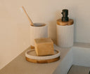 Distributeur de savon liquide élégant en polyrésine beige orné de détails en bois d'acacia naturel , conçu pour allier style et fonctionnalité. Son esthétique neutre et chaleureuse s'intègre harmonieusement aux salles de bains contemporaines ou classiques.