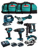 Le kit Makita contient Marteau perforateur DHP482 + Marteau DHR171 + Mini-meuleuse DGA504 + Visseuse à percussion DTD152 + Scie sauteuse DJV182 + Scie circulaire DSS610 + 2bat 5Ah BL1850B + Chargeur DC18RC + Sac à roulettes LXT600.