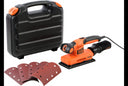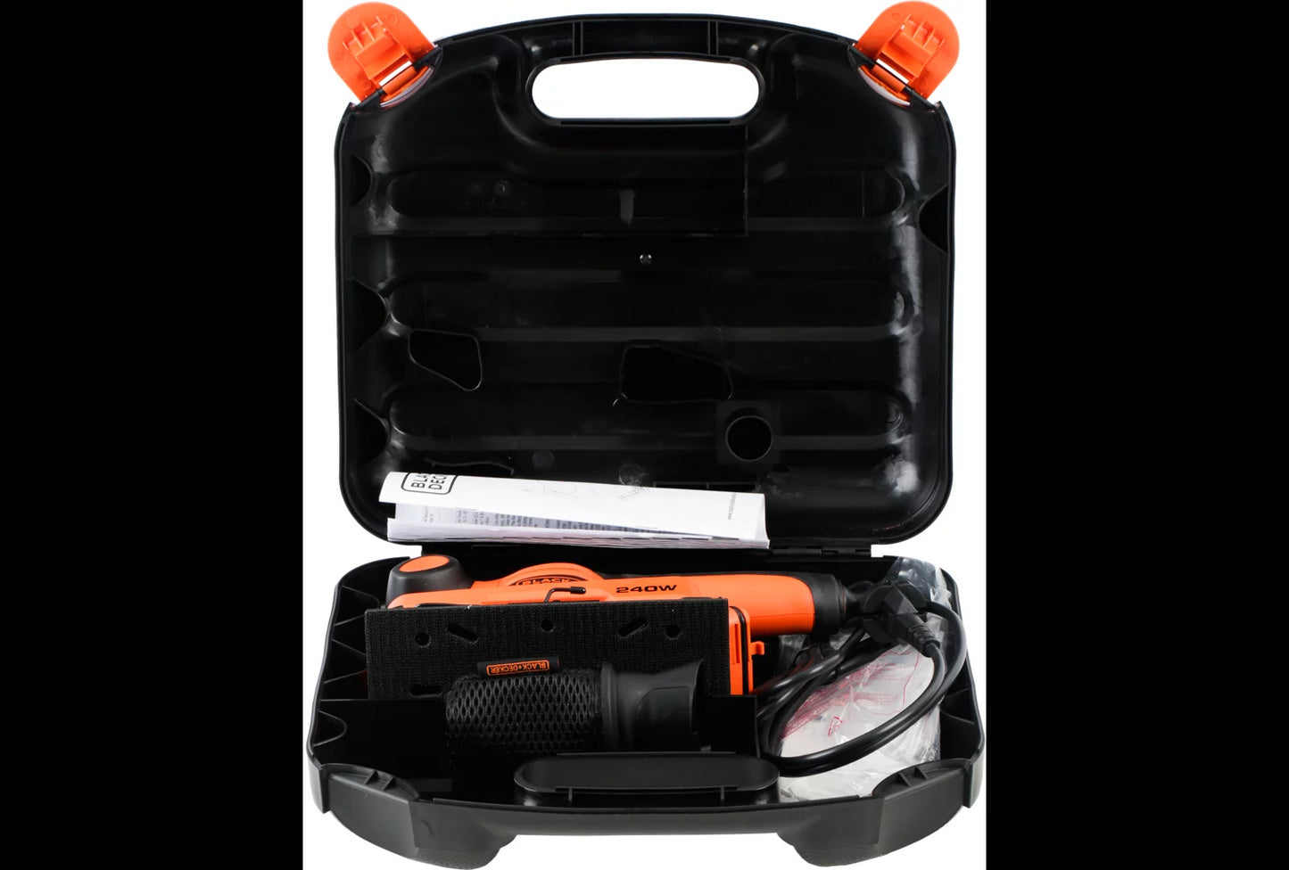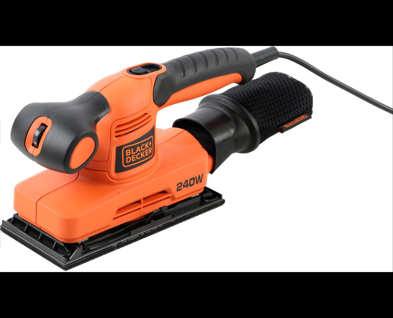 La ponceuse orbitale Black&Decker 240 W, modèle KA320EKA-QW L, est une machine légère avec un grand 1/3 de passe qui nous permet de poncer jusqu'au bord. Il est idéal pour les surfaces verticales telles que les portes ou les murs, avec des tâches de ponçage légères.