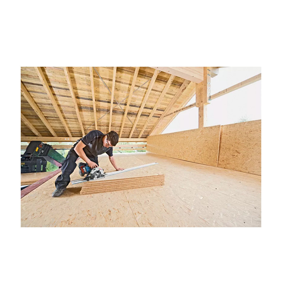 La scie circulaire sans fil est compatible avec le système de rails de guidage Bosch, qui garantit des résultats de coupe précis, ainsi qu'avec les systèmes de rails de guidage de Mafell, Festool et Makita. Il dispose d'un frein moteur rapide qui arrête immédiatement la lame de scie pour une meilleure protection de l'utilisateur.