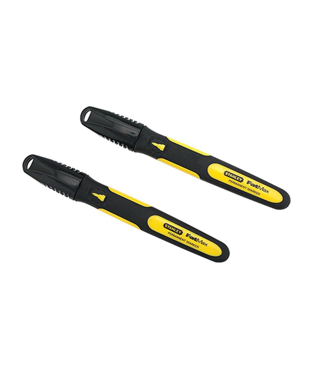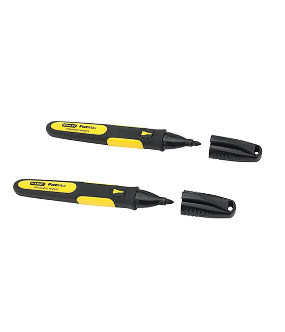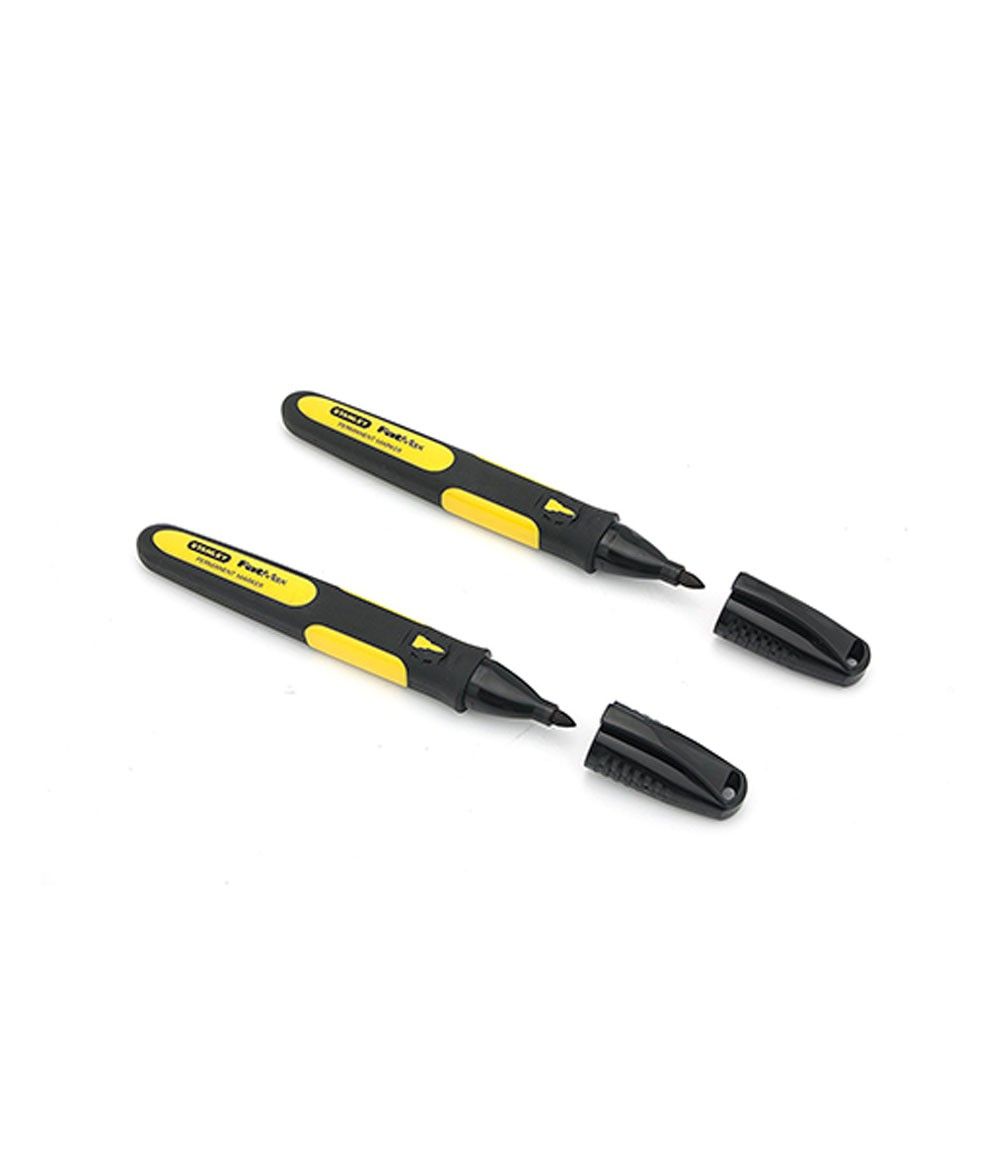 Blister contenant 2 unités de marqueur noir à pointe fine Stanley 0-47-312. Marqueur présentant une excellente résistance à l'effacement, à l'eau et à l'huile sur la plupart des surfaces et sèche très rapidement.
